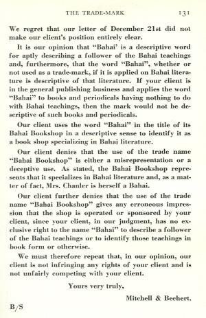 "By no stretch of imagination can we invest the members of the National Spiritual Assembly with the same innocence.... Then, why did they allow themselves to perpetrate the unethical act of concealing from the Commissioner of the United States Patent Office the fact that the word Bahai was derived from the name *Baha*, and that *Baha* was a person, and more, that he was the founder of a Universal Religion? The answer is of course plain. In such a case, they would have been refused the trade-mark!" (211).
