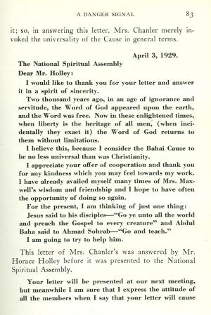 "The tendency toward organization had, from the very beginning, existed among the American Bahais, but it remained for Mr. Holley to develop it, to officialize it, to make it obligatory and to place the details of Bahai housekeeping (and not very good housekeeping at that) on a level with the Teachings of the Revelator of the Modern Age" (291).
