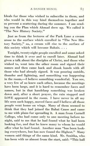 "By this time, large numbers of the members of the Bahai organization had actually jointed The New History Society. This membership with us in no wise affected their loyalty to the Center, for all of us looked on the new movement as a sort of recruiting station, and we often termed it as such" (93).